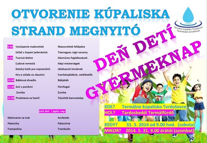 Srdečne Vás pozývame na Deň detí a Otvorenie letnej sezóny termálneho kúpaliska, ktoré sa uskutoční dňa 31. 5. 2014, v sobotu so začiatkom o 9.00 hodine.