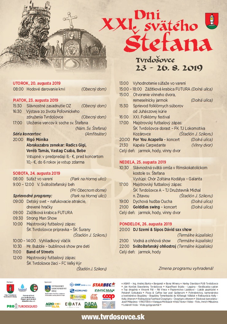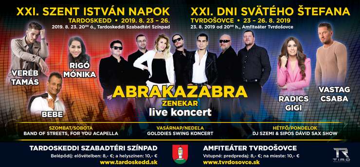 Oznamujeme Vám, že 23. augusta 2019, v piatok o 20.00 hod sa v rámci osláv Dní sv. Štefana začína na miestnom amfiteátri séria koncertov. Vystúpia: Rigó Mónika, Radics Gigi, Bebe, Vastag Csaba, Veréb Tamás a skupina Abrakazabra.